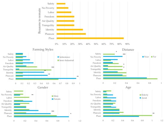 Regarding gender, we found that men were strongly connected to farm tasks (p < 0.1), while women mainly valued being on the farm the most (p < 0.05) and the recognition of the farms as a home (p < 0.15). Regarding age, we found that older adults (over 60 years old) were more willing to remain on the farm due to the recognition of the farm as a place to live (p < 0.05) (Figure 6).