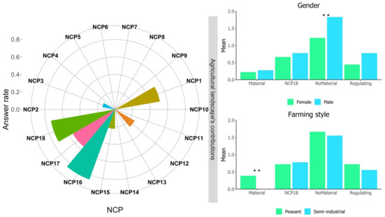 We found significant differences in the mean response for nonmaterial and material NCP across gender and farming style. Male identified more nonmaterial NCP than women (p < 0.1) (Figure 7). Male recognized farms as spaces where identities are supported, a source of satisfaction and experiences, family rootedness, and agricultural traditions. Among the stories recorded, we found examples such as “Every night there is a longing for the work of the other day” (rural man, 71 years old); “All my life I have lived in the countryside, I have always liked it. And in the area, everything is very quiet, it is safe” (rural man, 72 years old); “The farm gives me tranquility and brings back memories of my childhood, of my tradition. And it is also safe” (rural man, 26 years old).