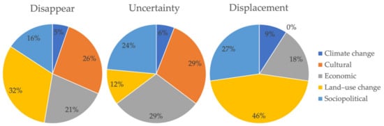 To explore how farmers and their families perceive the future of the rural landscape in the CCLC, we asked how do you imagine the future of the rural landscape? Responses were classified according to three categories: disappearance of rural areas, displacement, and uncertainty due to change. Additionally, we asked farmers to express motivation underpinning their responses, which were classified as both direct and indirect drivers of global change [41,42], including sociopolitical change and land-use change, as well as economic, cultural, and climate change (Figure 3). Two direct drivers were mainly recognized as change promoters in the region, i.e., land-use change and climate change. Additionally, we recognized visions associated with three indirect drivers: economy, political, and culture [43]. The economy was defined as per capita income and the taxes and subsidies provided by the government; the political reasons were defined as the mechanisms for the development of the rural sector; the culture was determined as values, beliefs, and norms that a group of people share.