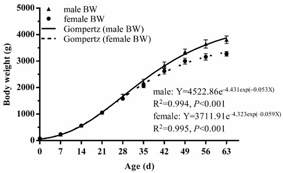 SPSS version 17.0 (SPSS, Inc., Chicago, IL, USA) was used for data analysis. To determine the growth curves of BW, muscle, and tibia traits of geese, three non-linear regression models (logistic, Gompertz, and von Bertalanffy) were chosen. The equations and parameters for the growth models applied are given in Supplemental Table S1. The non-linear modeling was carried out using the NLS procedures by the Gauss-Newton algorithm [12]. The goodness-of-fit of the functions was assessed based on the coefficient of determination (R2). The Gompertz model was finally selected as the optimized model for BW, male thigh muscle, tibia fat-free weight, and breaking strength, and the logistic model was chosen for breast muscle, female thigh muscle, tibia length, width, and ash. One-way ANOVA with Tukey’s post hoc comparison was used to determine the significance of the differences between the age groups of males and females, respectively. Independent-samples t-tests were performed to assess differences in sex at the same age. The 5% level of probability was considered significant. In this particular study, 63 d was the market age for these geese, so BW, muscle weight, and tibia measurements at 63 d (100%) were used to calculate relative growth at younger ages according to the method of Applegate and Lilburn [13].
