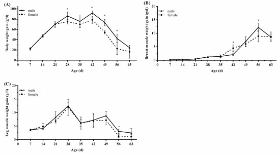 Absolute mass gain of body weight (A), breast muscle (B), and leg muscle (C) in goslings. The value for each specific day-age represents the average daily gain of the previous week. Values are given as means and standard deviation (n = 8). * represents significant difference (p < 0.05).