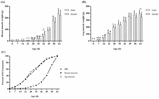 The dynamic change of breast muscle (A) and leg muscle (B) for male and female goslings from hatching to 63 d of age. Values are given as means and standard deviation (n = 8). Values followed by different letters (a–f; age) or * (sex) differ significantly (p < 0.05). (C) Fractional growth of BW and breast and leg muscle weights as a proportion of the measure at 63 d of age. Means represent 16 birds per age (combined male and female).