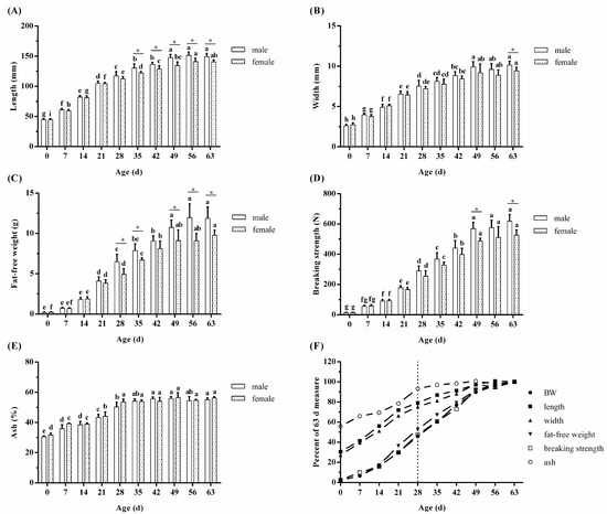 The dynamic change of tibia traits for male and female goslings from hatching to 63 d of age. The changes include the length (A), width (B), fat-free weight (C), breaking strength (D), and ash content (E). Values are given as means and standard deviation (n = 8). Values followed by different letters (a–i; age) or * (sex) differ significantly (p < 0.05). (F) Fractional growth of BW and tibia length, width, free-fat weight, breaking strength, and ash as a proportion of the measure at 63 d of age. Means represent 16 birds per age (combined male and female).