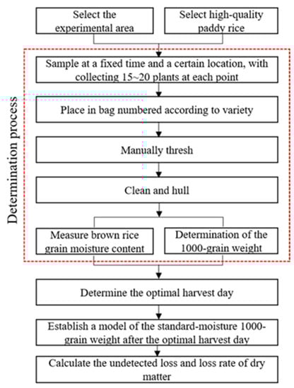 The optimal harvest day of each variety was determined by analysing the data, and a model of the standard-moisture 1000-grain weight after the optimal harvest day was established. Based on the average harvest day of high-quality rice in Northeast China, the latent loss and loss rate of dry matter were calculated via a nonlinear regression model. The various indicators were measured and calculated as follows.