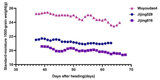 From Figure 2, it can be seen that the rice growth curve showed a downward trend, and the dry matter weight decreased with the heading days. In other words, if rice cannot harvest at the right time, the yield of paddy will decrease rather than increase as the number of days after heading increases. To verify that this conclusion does not exist by accident, our team introduced NMR moisture detection equipment to ensure the accuracy of the data and selected 18 representative varieties of high-quality rice from the experimental station in Northeast China, Jilin Province. Rapid and accurate NMR moisture detection technology was used to measure the moisture content of the brown rice grains of the different rice varieties (Supplementary Materials Table S1), after which the 1000-grain dry matter weight (Supplementary Materials Table S2). According to the data of the standard-moisture 1000-grain weight of the rice varieties (Supplementary Materials Table S3), the optimal harvest day was determined on the basis of the analysis results, as shown in Table 3.