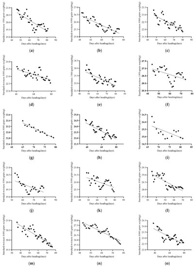 To analyse the direct effects of the standard-moisture 1000-grain weight and time after heading, both linear and nonlinear regressions were performed using all the data obtained. To determine the best model for each relationship, first- and second-order linear models were constructed, and the model with the highest adjusted R2 value was ultimately chosen. A linear regression equation between the standard-moisture 1000-grain weight (g) of water and the number of days after heading (days) was established using the determined optimal harvest day as the starting point, and the R2 value was calculated. The optimal harvest day was the day when the dry matter weight of grains reached the maximum value during rice growth (Table 1).