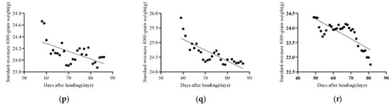 Linear regression curve of the standard-moisture 1000-grain weight in 2020:(a–r) means 18 rice varieties in 2020’s experiment, (a) Jijing 816; (b) Wuyoudao 4; (c) Longyang 16; (d) Songjing 29; (e) Longyang 7; (f) Fangyuan 77; (g) Jijing 561; (h) Longyang 13; (i) Zhongkefa 5; (j) Jinongda 667; (k) Wokeshou 1; (l) Tianlong 619; (m) Jijing 511; (n) DF 416; (o) Qinglin 611; (p) Daohuaxiang 9; (q) Zaoxiang 7; (r) Zhongke 804.