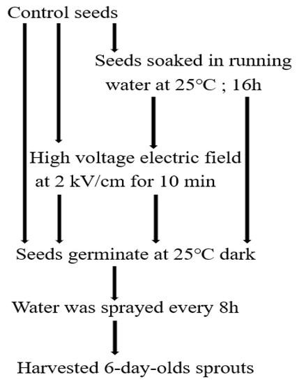 High-voltage electric field (HVEF) is a nonthermal technology frequently used in food industries [6]. Positive results in the germination improvement were also obtained with HVEF application. The use of HVEF treatment was reported to enhance the germination of chickpea (Cicer arietinum) and bitter gourd (Momordica charantia) seeds [23,24]. However, the electrical field treatment did not significantly increase the germination of treated carrot (Daucus carota L.) seeds [25]. Thus, the effectiveness of electrical field treatment, which is affected by several important factors such as electric field intensity and treatment duration, appears to be crop species dependent.