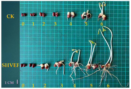 HVEF is reported to promote the growth of mung bean sprouts [36]. In this study, significant differences in sprout growth existed among the seeds receiving different seed treatments (Table 1). The sprouts subjected to different seed treatments exhibited greater sprout growth and longer sprout length than that of the control group. The sprout fresh weight and length produced from SHVEF-treated adzuki bean seeds were 343.72 g 100 seeds−1 and 12.84 cm, respectively, which were 69% and 145% higher than untreated control seeds (203.40 g 100 seeds−1 and 5.24 cm) (Table 1), (Figure 3). The exhibited differences in seed germination and sprout growth among control seeds and the seeds receiving different seed treatments are possibly caused by the different water absorption levels observed (Figure 4), which might have initiated metabolic activities that prepare sprouts for growth [19].