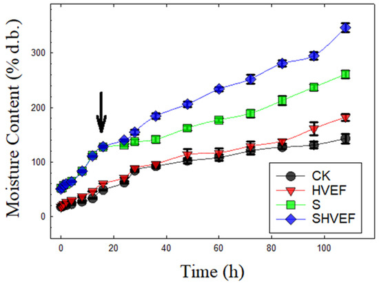 As shown in Figure 4, significant differences in hydration level existed among the tested adzuki bean seeds receiving different seed treatments, with the control seeds exhibiting significantly lower water uptake than the seeds receiving different seed treatments. Soaking the seed in running water for 16 h appeared to increase seed moisture level and reduce the seed coat’s resistance to water flow. Therefore, the seed moisture level of seeds receiving soaking treatment was considerably greater than the seed moisture level of untreated control seeds at the end of 110-h hydration period. Limited studies were available to show the effect of electric fields on seed hydration. HVEF treatment was reported to accelerate the seed hydration in oat [20] and chickpea seeds [39]. In this study, the seed hydration levels at the end of 110 h of water uptake were in descending order of SHVEF-treated seeds (310%) > S-treated seeds (220%) > HVEF-treated seeds (180%) > untreated control seeds (130%) (Figure 4).