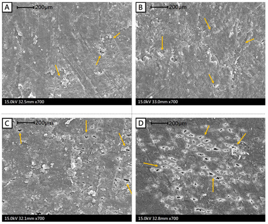 The microstructure (SEM, 15 kV, 700 X) of seed coat surface of control seed (A); soaking-treated seed (B); high-voltage electric field-treated seed (C); soaking + high-voltage electric field-treated seed (D). The arrows indicate treatment-induced cracks on the seed coat surface.