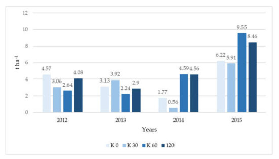 The analysis of the effect of the CaSO4 fertilization showed that, in the subsequent years of the study, the yields increased in all the K combinations. In comparison with the K 0 combination, the application of potassium at the doses of 30, 60, and 120 kg ha−1 in the variants without CaSO4 increased the yield of fresh matter by 8.36 t ha−1 (4.5%), 19.53 t ha−1 (10.6%), and 27.52 t ha−1 (14.9%), respectively. In comparison with the K 0 combination, the application of potassium at the doses of 30, 60, and 120 kg ha−1 in the variants with CaSO4 increased the yield of fresh matter by 6.22 t ha−1 (3.11%), 23.7 t ha−1 (11.8%), and 31.93 t ha−1 (15.9%), respectively.