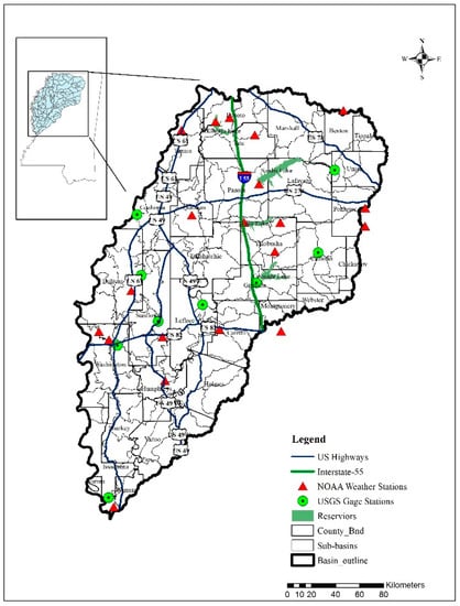 Location of the Yazoo River Watershed showing weather and USGS gage stations.