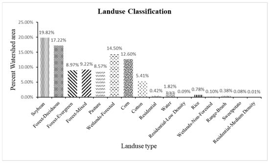 Land use characteristics include Agriculture, forest lands, wetlands, lakes, and urban areas. Major crops in agricultural land use are Corn, cotton, Soybean, Pasture lands that accounts to 47.24%. Forest lands are classified as Deciduous, evergreen, and mixed types that cover majority of the watershed to 49.92%, the remainder land that is of 2.84% is covered with lakes, forested and non-forested wetlands, and urban areas as shown in Figure 2. Majority of the soils present in the watershed are Alligator, Dundee, Sharkey, Dowling, Forestdale, Smith-dale. This watershed is divided into 109 smaller watersheds (sub-basins) for ease of analysis in SWAT.