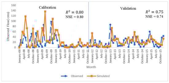 Monthly observed vs. simulated flow during model calibration and validation from Bogue Phalia gauge station.