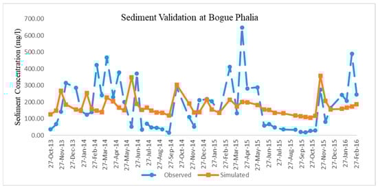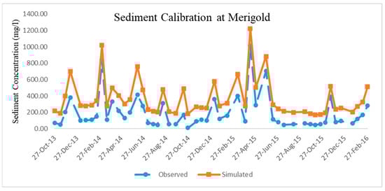For sediments, due to limited data availability, the model is calibrated and validated from 2013 to 2016 for 2 stations, at Leland (USGS07288650) and Merigold (USGS07288280). Model Performance resulted in Satisfactory, it is due to numerous peaks sediment concentrations due to extreme weather events such as heavy rainfall, snow, hail, and thunderstorms reported in 2014, 2015 in Washington County, Mississippi where the station is located [37]. The slope gradient in this region is very less, close to flat conditions, that are suitable for intense agriculture, resulting nominal flow during normal conditions. But, in the event of extreme weather events, this region is prone to flash floods, and high speed wind gusts during thunderstorms resulting increased sediment concentrations in the stream channel. The R2 and NSE values were 0.12 and 0.17 respectively for calibration and 0.17 and 0.14 respectively for Validation. Calibration of the model was done for Big Sunflower at Merigold (USGS07288280) and validation was done for station Bogue Phalia station (USGS07288650) as mentioned in Table 6. Figure 4 and Figure 5 show the trend plot.