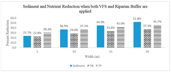 From this study, it is evident that implementing BMPs in a watershed have significant impact in improving water quality. VFS (in agricultural land), Riparian buffer (forested land) and combination of both have no impact on reducing streamflow, but these BMPs were effective in reducing the sediment concentration, TN, and TP. As both VFS and Riparian buffer are edge of field practices [35], size of the width is directly proportional to extent of reduction. All three scenarios were simulated for five different widths, starting with 0 m, till 20 m with 5-m increments. The highest reduction in sediment and nutrient outputs were at 20 m width for all three scenarios. The results obtained from this study were compared with other studies conducted in Big Sunflower River Watershed, in Mississippi [38], and Alger Creek watershed in Michigan [23] which implemented VFS in their respective watersheds to validate, results from both studies follow similar trend. Combination of VFS and Riparian buffer throughout watershed had the highest reduction of the three, with width of 20 m, it is observed that there is about 52% reduction in sediments, 37% reduction in total nitrogen and 46% reduction in total phosphorus. Therefore, it is recommended to have a combination of VFS and Riparian buffer for highest sediment, nutrient reduction that could result in improving water quality.