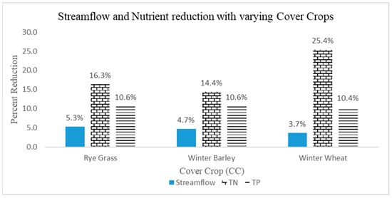 Cover crops (CC) are used to maintain soil nutrient concentrations and provide vegetative cover to minimize impact of rain drop during a storm event. Rye grass, winter barley and winter wheat had different impact in streamflow, TN, and TP concentrations as shown in Figure 9. Although there is no significant impact on sediments, it is observed that reduction in TN is significant, and ranged between 14% to 26%. Reduction in streamflow and Nutrient concentrations is listed in Table 8.