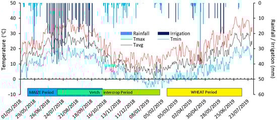The maize (plant density of 80,000 plants ha−1) and wheat (sowing rate of 230 kg ha−1) were grown inside an irrigated field with a 16 × 16 m2 permanent sprinkle system. Maize and vetch density were chosen as the recommended values in the region (in the higher part of the range for vetch because the sowing method and time are not the more appropriate and the termination date is sooner). The wheat sowing rate was higher than the recommended values for traditional wheat because this variety presents a very short cycle with a very low tillering rate. The P and K fertilization consisted of 70 kg P2O5 ha−1 and 120 kg K2O ha−1, before maize sowing, following the traditional dose in the region, in order to avoid phosphorus (P) or potassium (K) deficit. Soil management consisted of no tillage, sowing maize and wheat with a direct seeder. The vetch intercrop was broadcasted (160 kg ha−1) over the maize crop, without incorporation. All crop residues were left over the surface after being chopped.