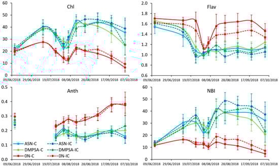Chlorophyll (Chl), flavonol (Flav), anthocyanins (Anth) and NBI indexes (all of them dimensionless) estimated with the Dualex® for the different treatments along the maize cycle. Bars represent the standard error. Treatments were combinations of ASN, ASN + DMPSA (DMPSA) or no N fertilization (0 N) and the intercropping use (IC) or absence (C).