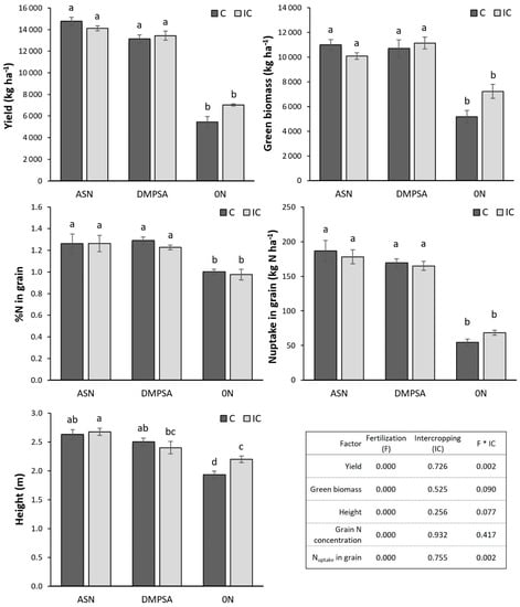 Maize grain yield (dry matter), green biomass (dry matter) and height for the different treatments. Letters indicate statistical differences between treatments (p < 0.05). Treatments were combinations of ASN, ASN + DMPSA (DMPSA) or no N fertilization (0 N) and the intercropping use (IC) or absence (C). The table shows p-values for different factors in relation to its effect on the different measured variables.