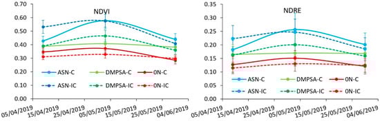 NDVI and NDRE indexes estimated with the RapidScan® in the different treatments along the wheat cycle. Bars represent the standard error. Treatments were combinations of ASN, ASN + DMPSA or no N fertilization (0 N) and the intercropping use (IC) or absence (C).