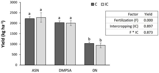 Wheat grain yield (dry matter) different treatments. Bars represent the standard error. Letters indicate statistical differences between treatments (p < 0.05). Treatments were combinations of ASN, ASN + DMPSA or no N fertilization (0 N) and the intercropping use (IC) or absence (C). The table shows the p-value for different factors in relation to wheat grain yield.