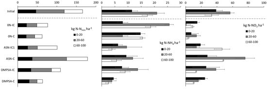 Initial soil inorganic N content in the 0–60 cm layer was slightly high (110 kg N ha−1 and 153 kg N ha−1 at 0–100 cm depth), but the entire field was homogeneous and no differences were found between treatments. After maize harvest, the soil Nmin decreased by at least one-third in all the treatments, except in the ASN one without an intercrop (Figure 6). Non-fertilized treatments showed one of the most remarkable reductions in residual Nmin. However, this decrease was mostly due to the nitrate reduction, because ammonium content tended to increase with respect to the fertilized treatments. Focusing on the differences between fertilized treatments, it is possible to observe two important effects. First, the regular ASN without the intercrop treatment greatly increased the residual Nmin with respect to the other fertilized treatments (and mostly with respect to DMPSA with the intercrop). Secondly, DMPSA treatments decreased the residual Nmin content below 60 cm (reducing the leaching risk during the autumn and winter), but without a reduction in the superficial residual Nmin content (providing similar sowing conditions to the spring wheat).