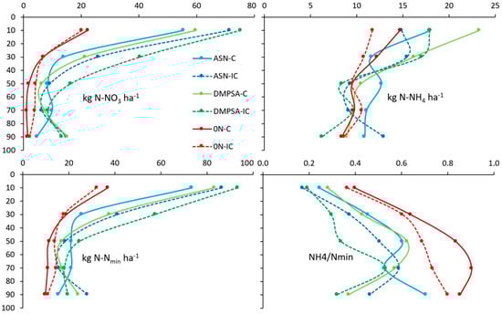 Analyzing the relationship between nitrate and ammonium content at each treatment and depth, three different patrons were observed, indicating the possible effect of the different fertilization strategies (Figure 6). In the non-fertilized soils, the nitrate content tends to be similar or smaller than the ammonium along the entire profile, while in the fertilized soils with regular ASN, the nitrate content was always larger than the ammonium, and this relationship increased with depth (from 3 at the surface, to 4 at medium depth and 10 at the deepest one). Finally, the fertilized soils with DMPSA presented an intermediate situation, with larger contents of nitrate with respect to the ammonium, but contents that were not so large and more constant or tending to decrease with depth (4.5 at the surface, 3.5 at medium depth and 2.75 at the deepest one). This difference in the proportion suggests an actual decrease in the nitrification rate; moreover, it also shows a smaller risk of nitrate leaching in the DMPSA treatments with respect to the regular ASN ones.
