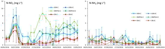 The ammonium concentration in the drainage water at 1 m depth along the entire maize–wheat cycle continued presenting very constant values without differences between treatments (around 0.39 mg N-NH4+ L−1 on average). However, the nitrate concentration presented differences not only between dates, but also between treatments, although always presenting values below the 15 mg N-NO3− L−1 threshold fixed for human consumption and even below the 12.3 mg N-NO3− L−1 original irrigation water concentration (Figure 8). Although there were few statistical differences due to the great variability between suction cups, there was a tendency for the nitrate concentration to increase during July. During August, the nitrate concentration in the drainage water decreased in all the treatments to values close to 0 mg N-NO3− L−1, but the reduction was slower in the ASN without intercrop treatment, suggesting a lower risk for nitrate contamination in the alternative cropping systems (including DMPSA or an intercrop). However, at the end of the maize cycle, a new increase in the nitrate concentration in the drainage water on the DMPSA treatment without the intercrop could be suggesting some uncoupling effect in the nitrification rate with respect to the crop demand, which can be ameliorated with vetch intercrops. During the wheat cycle, the larger concentrations were found in the DMPSA-C treatment, with an average concentration of 5.7 mg N-NO3− L−1 since the maize harvest. On the contrary, the minimum value among the fertilized treatments was usually the ASN-C, with an average concentration of 2.8 mg N-NO3− L−1 since the maize harvest. Between the previous treatments, we can find both intercropped treatments, DMPSA-IC and ASN-IC, with an average concentration of 3.2 and 3.9 mg N-NO3− L−1, respectively. The unfertilized plot usually presented very low values along the entire cycle, but the nitrate concentration tended to increase as the crops’ cycle advanced. In this case, there was no intercrop effect.
