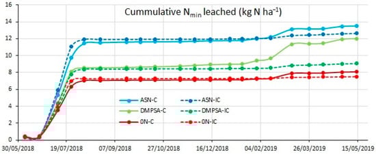 The WAVE model estimation for the amount of drainage water in non-intercropped treatments was larger than in the intercropped plots (37 mm and 11 mm, respectively). This ultimately leads to a reduction in the cumulative Nmin losses through leaching in the intercropped treatments, with the DMPSA-IC treatment showing approximately a 30% reduction in the amount of N leached and reaching results similar to the non-fertilized treatments. These results follows the same pattern as previous experiments, where maize intercropped with different species helped to ameliorate nitrate leaching [,,].