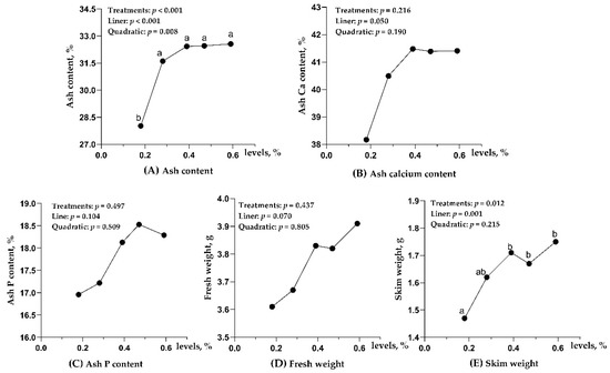 The femur’s length, fresh weight, and skim weight were reduced (p < 0.05), with a dietary NPP level of 0.18% as compared with other groups (Table 5). No difference was observed in the femur variables in the other groups with NPP levels between 0.28% and 0.59% (p > 0.05). The length, fresh weight, skim weight of the femur showed a linear relationship with dietary NPP levels between 0.18% and 0.59% (p < 0.05). The ash content of the third phalanx was reduced (p < 0.05) with a dietary NPP level of 0.18% as compared with other NPP levels (Figure 1). The Skim weight of the third phalanx was reduced (p < 0.05) with a dietary NPP level of 0.18% compared with the three dietary NPP levels between 0.39% and 0.59%. No difference was observed in the skim weight between 0.18% and 0.28% (p > 0.05). The variables of the third phalanx did not differ with NPP levels among 0.39% and 0.59% (p > 0.05). The third phalanx’s skim weight and ash content showed a linear relationship with dietary NPP levels between 0.18% and 0.59% (p < 0.05).