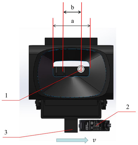 Schematic diagram of fiber position (The arrow is the direction of movement). a: Slit length; b: motion detection effective distance; 1: the optical fiber; 2: photoelectric switch triggering position on fruit cup; 3: photoelectric switch.