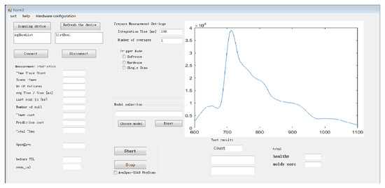 The detection equipment had 48 fruit cups in total, which carried one apple per cup to move forward. The top-down view of the layout of the fiber, the photoelectric switch, and fruit cups is shown in Figure 2. The fiber was fixed under the fruit cups using a specially designed optical fiber bracket. As shown in Figure 2, a 50 mm long slit was carved into the bottom of the fruit cup to facilitate the collection optical fiber to obtain the transmitted light of the apple placed on the fruit cup. When performing the motion detection, the position of the optical fiber was placed 10 mm away from the beginning side of the slit in order to make the collected spectrum contain more useful information about the source of moldy core disease, i.e., the apple heart. Thus, during the moving of apples, the optical fiber captured signal from central areas of the apples around the stem–calyx axis. Taking into account the size range of all the samples, the center area of each apple occupied approximately from 2/3 to 3/4 of the area of the apple to be tested. The spectrometer was triggered to start collecting the stationary spectra by the host computer program. After manually placing the sample, stationary spectra were acquired by clicking the program start acquisition button. The program interface diagram is shown in Figure 3. When collecting the motion spectra, the fiber position was as shown in Figure 2 when the photoelectric switch was exactly about to be triggered by the elastic part of fruit cups. Then the trigger signal was transmitted to the spectrometer to start collecting spectrum.