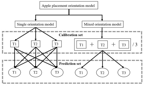 The above studies mainly focused on stationary detection in the laboratory or motion detection on a simple prototype, and the application level mostly stayed in the laboratory stage without realizing online detection application. In addition, the orientation of the samples when collecting spectra is also an important factor that affects the quality of the spectra in the online detection process [21,24]. Han et al. [25] compared the effects of three fruit-placement methods (T1: stem-calyx was horizontal; T2: fruit stem was facing down; T3: fruit stem was facing down) on the detection of soluble solid content in apples, and the results showed that the T1 direction model had the best performance among the three directions. During the actual commercial fruit online detection process, after the automatic loading of a large number of fruits, the orientation of fruits on the detection line is random. For the detection of relatively homogeneous indicators such as sugar content and acidity, online detection of these indicators has been realized by many researchers. However, for the detection indicator of moldy core disease, the affected tissue inside the diseased fruit is unevenly distributed. Motion detection is more effective than stationary detection, but it is still greatly affected by the placement orientation of the fruit on the test line. Therefore, it is of great significance to study the influence of fruit detection orientation relative to light source and optical fiber to improve the accuracy of online detection. To date, Vis/NIR technology has made certain research progress in the orientation of fruit internal quality inspection, but few reports have examined the influence of fruit detection orientation on spectral information to ensure accuracy of online detection.