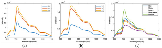 Figure 6 illustrates the raw energy spectrum of healthy apples and diseased apples collected in a stationary state. Figure 6a shows the average spectra of all three orientations of healthy apples, and Figure 6b shows the average spectra of all three orientations of diseased apples. Comparing Figure 6a and Figure 6b, the NIR spectra of apples mainly had three relatively obvious absorbances, which appeared in the form of troughs in the transmission spectrum curve. There was a strong chlorophyll absorption peak near 670 nm, and the absorption peaks at 840 nm and 970 nm were generally related to water or O-H functional groups [30]. Compared with diseased apples the spectrum curve trend of healthy apples of three orientations was more consistent, which could be because the internal organization of healthy apples was more uniform than that of diseased apples. The difference in spectral intensity might be due to the influence of the calyx and the size of the apple on the light transmission, which meant that the orientation of the apple relative to the light source had a significant influence on the intensity of the transmittance spectrum.