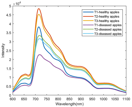Figure 8 illustrates the mean motion spectrum of healthy apples and diseased apples in three orientations. Overall, the trend of the motion spectral curve was similar to that of the stationary spectrum. For one orientation, the spectral intensity of healthy apples was significantly higher than that of diseased apples. The internal tissue of the diseased fruit changed to become more light absorbable than healthy tissue, resulting in differences in intensity. The most obvious difference between the spectral curves of healthy apples and diseased apples was that the intensity difference was the largest at the peak of 716 nm, and from 716–737 nm, the slope of the curve of healthy apples was significantly greater than that of diseased apples. At 806 nm, there was a small peak in the spectra curve of healthy apples, while the diseased apples’ spectrum curve had almost none (Figure 8). Of course, it was impossible to distinguish healthy and diseased apples solely by spectral curve characteristics, and thus, further analysis was performed.