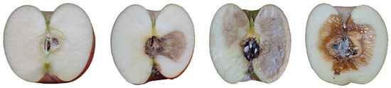 Apple moldy core disease is a common internal disease caused by several (up to seven) fungal pathogens [4]. Regardless of the degree of internal moldy core and carpel region, it would seriously affect the fruit quality and customer satisfaction. Generally, the moldy core infects apples at its early developmental stage. There are no apparent symptoms or external features on the exterior visually, and the conventional quality-control methods performed by the machine visualization of the apple-processing industry cannot detect a case where the internal moldy core exists [5]. Even if the myocardial infection is started in the field, the number of affected fruits after storage is higher in the cold room [6]. In addition, if apples with moldy core disease enter further processing for apple juice production and wine brewing, the diseased tissues will enter the apple juice, cider, and other by-products. This can cause spoilage of these apple products and byproducts, and the mycotoxin level also exceeds the predetermined threshold value of food regulatory agencies [7,8]. Therefore, a non-destructive detection method is critical to detect apples with moldy core disease early at post-harvest so as to improve fruit quality and reduce or eliminate food safety hazards caused by the moldy core disease.