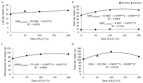 Leaf dry matter (MSF) at 58 days after sowing (DAS) (A), stem dry matter (MSC) at 30 and 58 DAS (B), aboveground dry matter (MSPA) at 58 DAS (C), and grain dry matter (MSG) (D) as a function of potassium doses. Rio Verde, Goias, 2019–2020 gowing season. ** and *: significant at 1% or 5% probability.