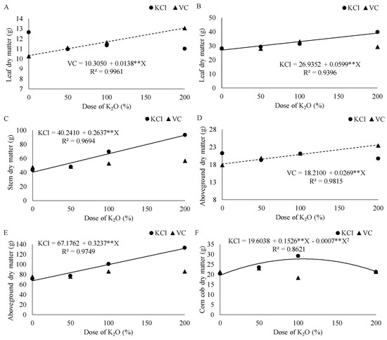 Plots of the interactions of potassium sources and doses for leaf dry matter (MSF) at 30 and 86 days after sowing (DAS) (A,B), stem dry matter (MSC) at 86 DAS (C), above ground dry matter (MSPA) at 30 and 86 DAS (D,E), and cob dry matter (MSSBG) (F). KCl: potassium chloride; VC: concentrated vinasse. Rio Verde, Goias, 2019–2020 gowing season. **: significant at 1% probability.
