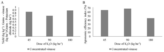 As an alternative source to organic potassic fertilizers, grain yield produced using concentrated vinasse as a function of that produced using potassium chloride was 0.84, 0.71, and 0.89 kg at the 45 kg·ha−1, 90 kg·ha−1, and 180 kg·ha−1 doses, respectively (Figure 5A).