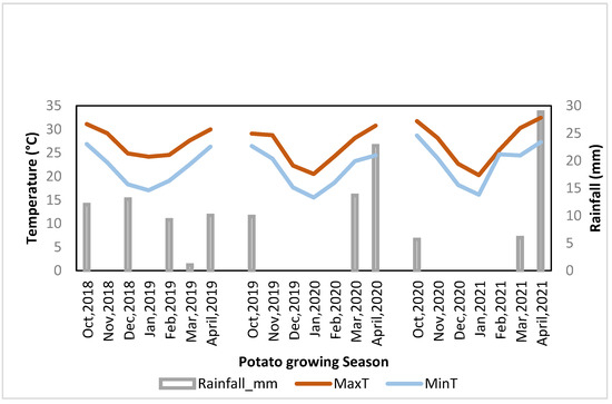 Monthly average temperature (maximum and minimum) and rainfall variation in Debiganj during the potato-growing season in 2018/2019, 2019/2020, and 2020/2021.