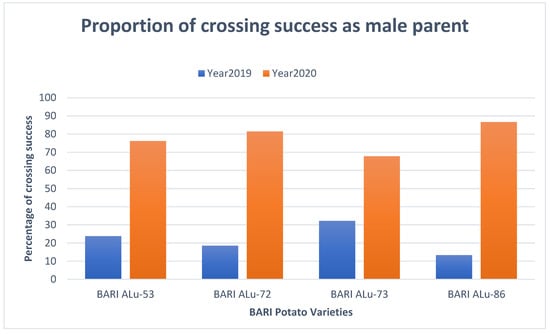 BARI-released varieties required 43 to 128 days to flower initiation (Table 2). Considering both years, BARI Alu-47 required minimal days to flower (43 days and 44 days, respectively). BARI Alu-41 requires a maximum of 94 days to flower in 2019–2020, while BARI Alu-25 required the most days (128) to flower in 2020–2021 (Supplementary Table S1). In our study, 34 successful crosses were made during 2018–2019, and 4152 crosses were successful during 2019–2020 (Supplementary Tables S2 and S3). BARI Alu-72 was used as a male parent 5 times and 22 times in 2018–2019 and 2019–2020, respectively, with other parents. BARI Alu-86 was used as a male parent 6 times and 39 times in 2018–2019 and 2019–2020, respectively, with other parents (Figure 2). BARI Alu-86, BARI Alu-72, BARI Alu-73, and BARI Alu-53 were crossed as male parents based on the proportion of successful crosses over total crosses (Supplementary Table S4). The BARI Alu-86, BARI Alu-72, BARI Alu-73, and BARI Alu-53 were chosen as the best male parents based on their diversity and capacity to produce abundant fertile pollen within a short season and less flower drop. The consumers of northern Bangladesh choose BARI Alu-86, which has red skin and a long oval shape, while those in Bangladesh’s southern region prefer BARI Alu-72, which has white skin and is salt tolerant. Though several of the male parents outperformed their female counterparts, we only considered two of the male parents for this study: BARI Alu-86 and BARI Alu-72. The proportion of crossing success as a female is also presented in Supplementary Table S5.
