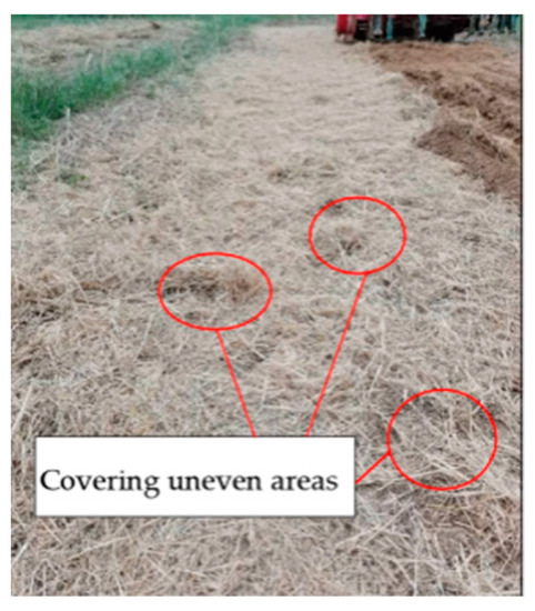 Straw content in the field was an important factor affecting the smoothness and reliability of conservation tillage [19]. The fundamental problem faced by the existing no-tillage machines and tools is that excessive straw residues on the ground entangle the machines and tools and hinder the seeds from entering the soil, which leads to the problems of seeding (seeds are easily sown on straw without emergence), drying (seeds are not covered with soil completely after sowing, without emergence) and missing sowing. The working process of the straw crushing and scattering sowing system shown in Figure 1 creatively solves this fundamental problem. Its solution strategy is as follows: The physical change and spatial transfer of straw, leveling the surface plough layer, creating a clean seedbed, and other functions are completed through the links of straw crushing, transverse transportation, air throwing, rotary scattering, multi-directional landing, uniform covering, etc., so as to provide the best environment for seed implantation, while the sowing system smoothly sows and fertilizes the straw in the process of “spatial transfer” of straw, and at the same time uniformly covers the ground straw after sowing plays a role of heat preservation and moisture preservation for the smooth growth of seeds in the later stage. This system has fundamentally solved the problems of planting, drying, and missing sowing, and has the advantages of green sustainable farming. However, due to the differences in moisture content of straw, unreasonable structural parameters, complex spatial movement characteristics of straw and other reasons, the existing uniform scattering system has the problems of high specific power consumption and low uniformity of straw coverage (Figure 2). Because of the simple structure, maturity, and reliability of the sowing system, the influencing factors are found out by developing a uniform scattering system test stand.