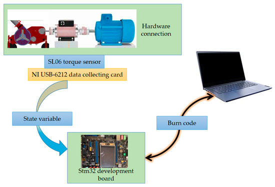 The specific power consumption test system of the straw crushing and throwing system consists of two parts: The instrument hardware platform and the software platform (Figure 4). The hardware platform of the instrument included: ① YP2-280S variable frequency motor; ② SL-06 dynamic torque sensor, working voltage ±15 V, accuracy 0.5% f s, frequency signal output: 5~10 kHz, level 5 V; ③ NI USB-6212 acquisition card, with 16 analog input channels (16-bit resolution, sampling rate of 400 KS/s), 2 analog output channels (16-bit resolution, sampling rate of 250 KS/s); ④ 12 V battery, rated capacity C of 5 ah; ⑤ HDP05-12D15 DC-DC converter, which converts the 12 V DC supplied by the battery into 15 V and supplies power to the torque sensor; ⑥ Notebook computer with driver and data acquisition program.