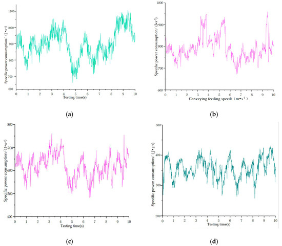In this single factor experiment, the moisture content of the selected straw was 30.2%, and the rotating speed of the grinding cutter shaft was kept at 1900 r/min. Figure 7 showed the changes of specific power consumption with time in the test period at four levels, with the corresponding average specific power consumption of 870.2, 780.7, 620.1, and 340.8 J/s2, and the corresponding peak-valley differences of 400, 300, and 400, respectively.
