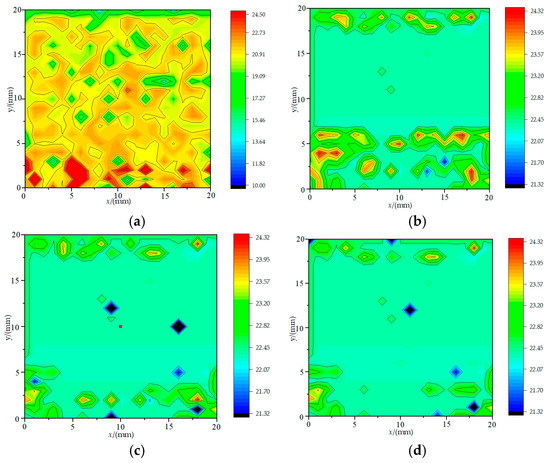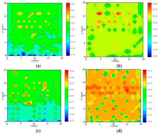 Figure 12 shows the change of coverage uniformity with time in the test period under four levels; the corresponding average coverage uniformity was 87.62%, 89.14%, 96.75%, and 87.65%, respectively, which indicates that the coverage uniformity first increased and then tended to be consistent with the increase of straw moisture content. The corresponding coverage thickness ranges were: 0.1969~0.2548 m (F3M1), 0.2035~0.2512 m (F3M2), 0.1955~0.2712 m (F3M3), and 0.1862~0.2735 m (F3M4), respectively. There were obvious “uneven areas” in the areas closer to the x-axis (the test area closer to the end of the test bed) at F3M1 and F3M2 levels, and this phenomenon was different between F3M3 and F3M4.