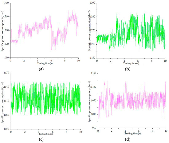 (a) Changes of specific power consumption at F1T1 level; (b) Changes of specific power consumption at F1T2 level; (c) Changes of specific power consumption at F1T3 level; (d) Changes of specific power consumption at F1T4 level.
