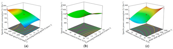 Figure 13a shows that the specific power consumption increases obviously with the increase of conveying and feeding speed X1, and the specific power consumption increases obviously with the increase of cutter shaft speed X2, and the influence of cutter shaft speed X2 on the specific power consumption was greater than that with conveying and feeding speed X1. Figure 13b shows that the specific power consumption first decreases and then tends to be flat with the increase of water content X3; Figure 13c shows that the specific power consumption obviously increases with the increase of the cutter shaft speed X2.