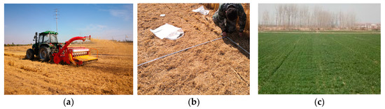 Test indexes and methods were designed and investigated according to NY/T1768-2009 “Technical specification for quality evaluation of no-tillage seeder” and JB/T6678-2001 “Straw crusher-returning machine”, which passed the field test and followed the later growth trend [26]; the field experiment is shown in Figure 16.